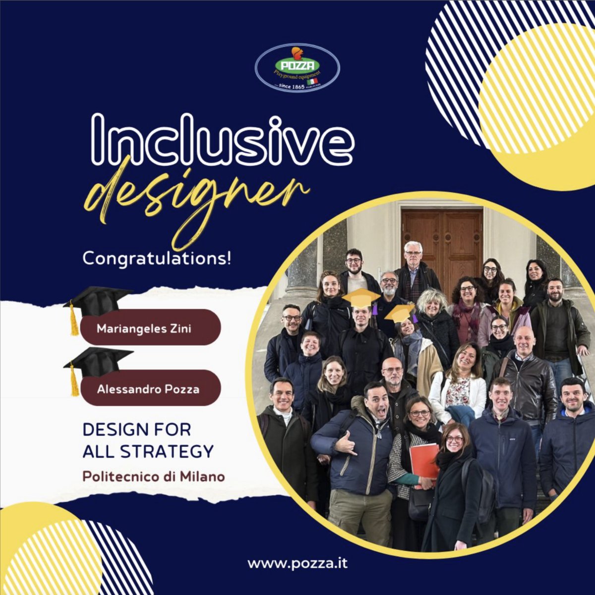 We are thrilled to congratulate Mariangeles Zini and Alessandro Pozza for successfully completing the advanced training course in ‘Design for All Strategy’ at the Politecnico di Milano! Thanks to this course, they have expanded their skills in accessible and inclusive design, bringing new energy and innovations to the projects at Pozza Playground.
