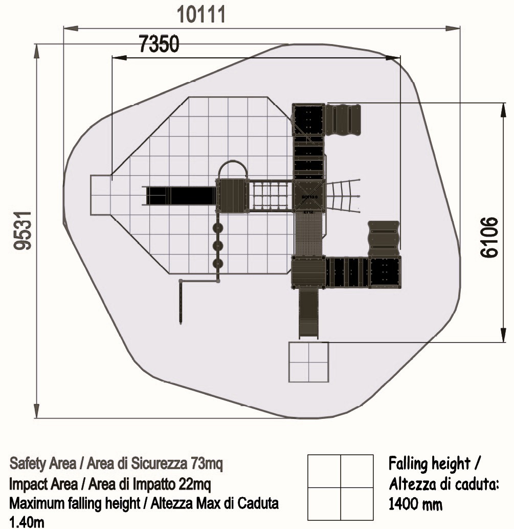- NR 1 Torre quadrata, pedana h 140 cm Fantasy alluminio - Torre altezza 140cm Realizzata con nr 4 montanti in alluminio EN EV6060 anodizzato con profilo speciale 90mm x 90mm con spigoli arrotondati raggio 32mm e anime interne di rinforzo spessore minimo 2,7 mm tutta la bulloneria e fissaggi in acciaio inox, 1 pianale dimensione 1040mm x 1040mm realizzato con profili in acciaio zincato e verniciato e pedana in plastica riciclata al 95% seconda vita spessore 25mm. Tetto realizzato con due falde in polietilene HDPE composto per il 51% di plastica riciclata spessore 20mm e un pannello curvo in polietilene