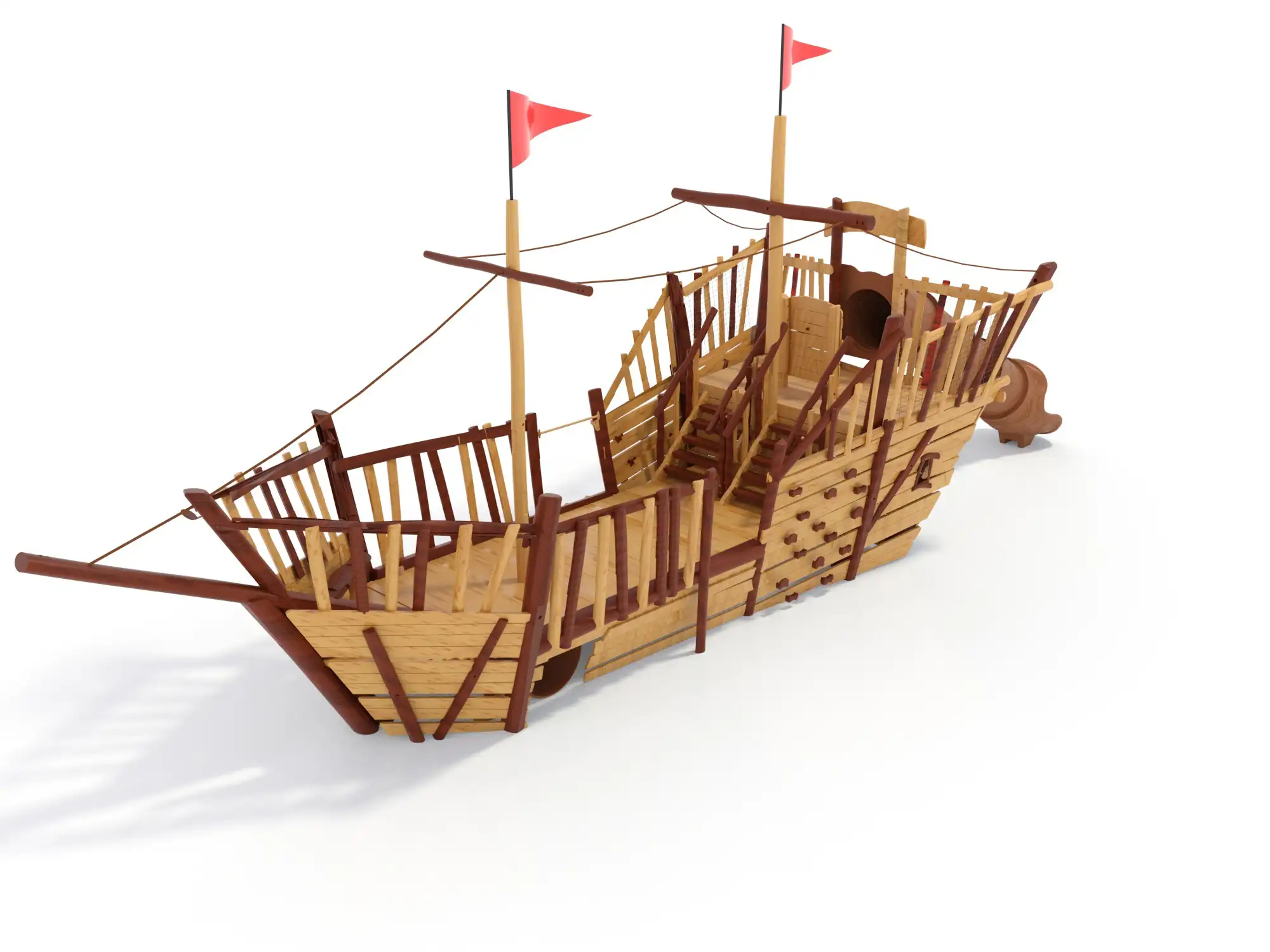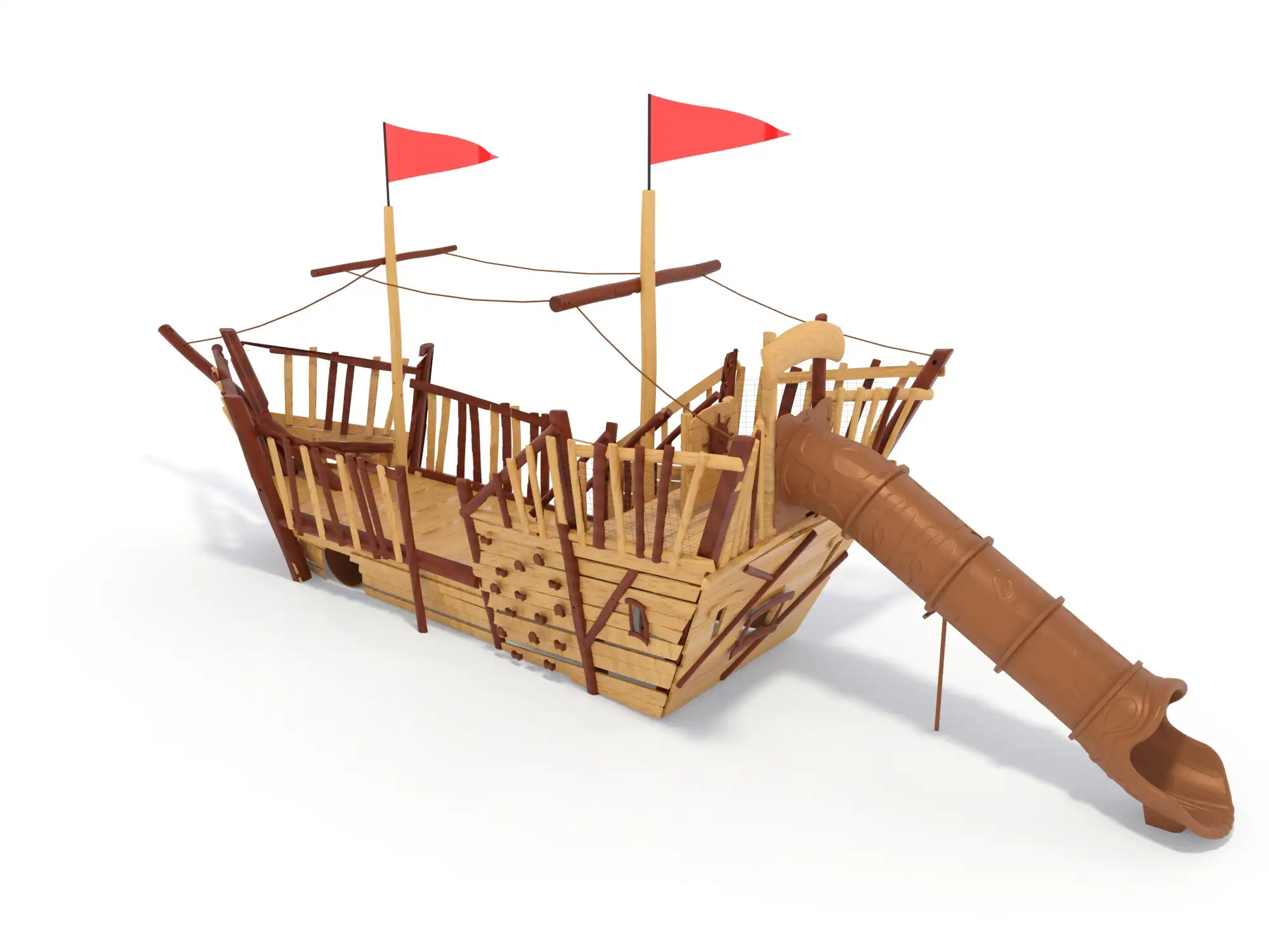 CARAVELLA PRIMITIV CON SCIVOLO A TUBO - multi-level structure 2-masted boat with tube slide / V0600.SW-14 style PRIMITIV / Made of chestnut or black locust tree, peeled, smoothed, and with a natural and colored finish.
