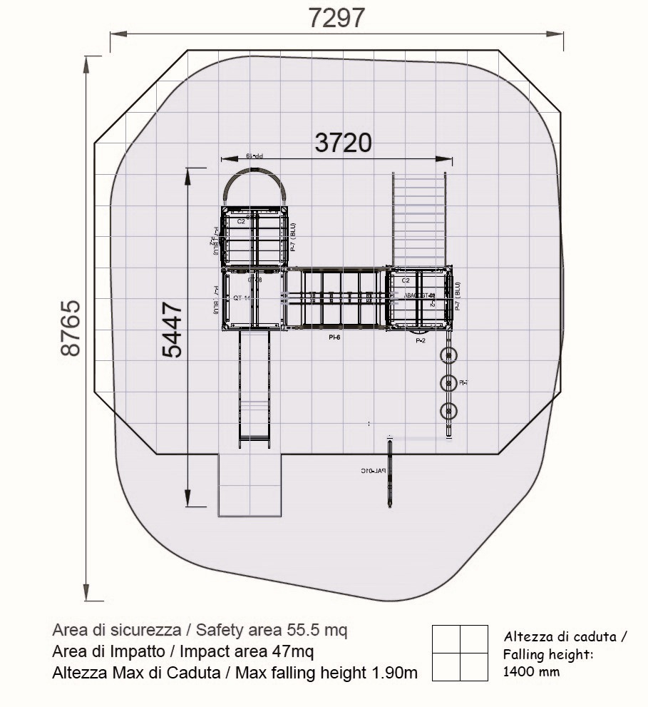 Multilevel structure, gymnasium, Tibetan bridge, slide and fire pole.