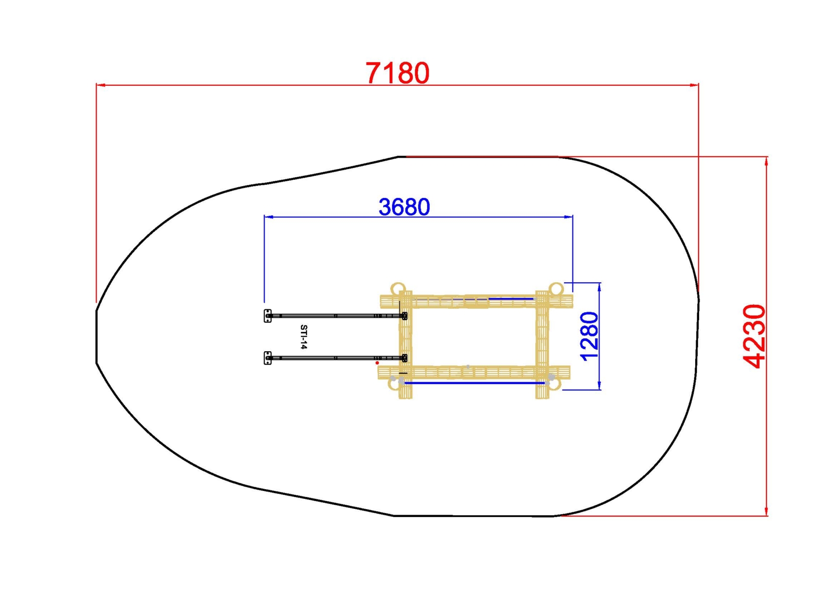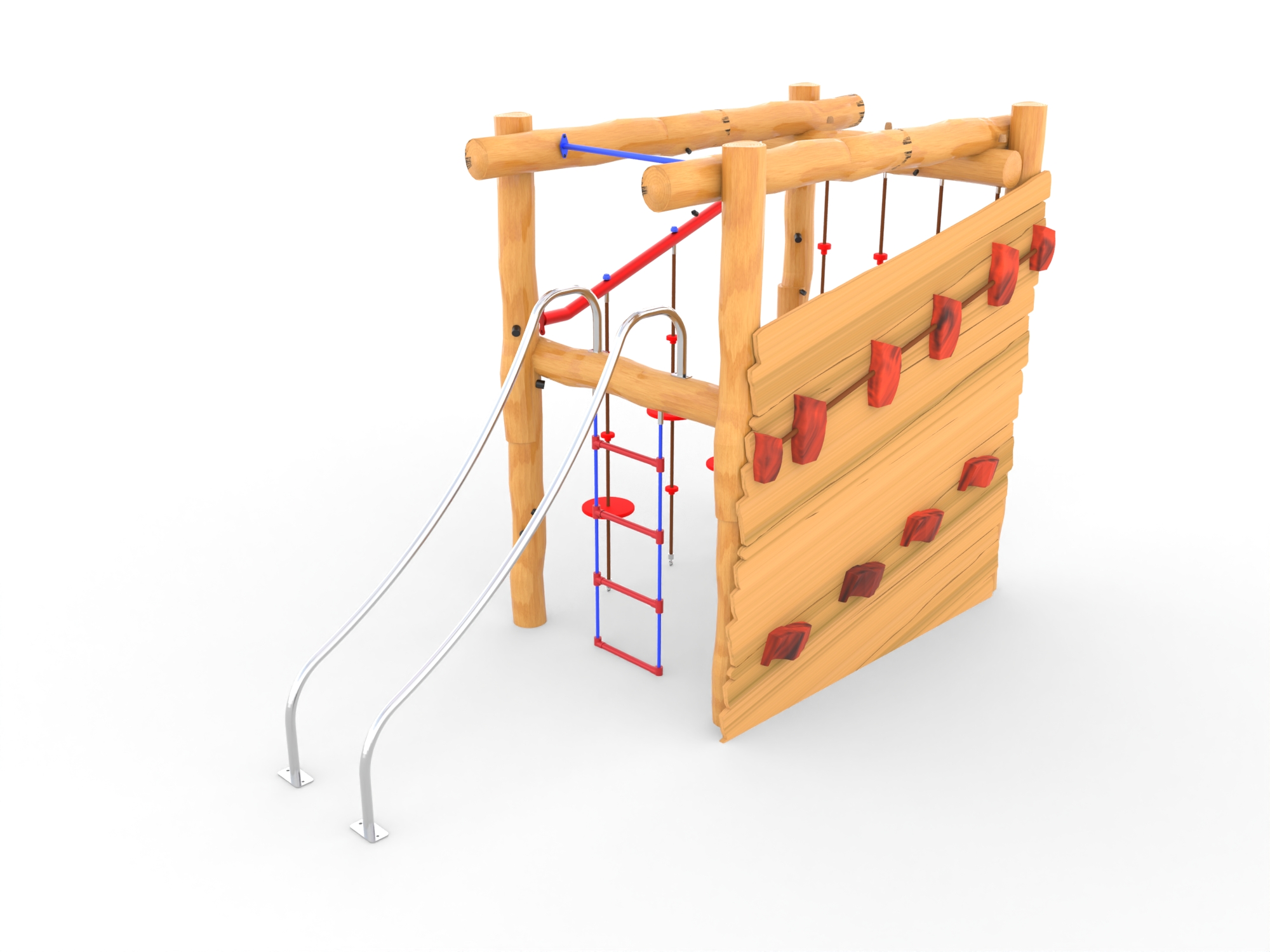 - NR 1 Kit palestra lineare - realizzata con struttura portante in legno lamellare impregnato a pressione in autoclave, rete di arrampicata in corda di acciaio rivestita e fissata alla struttura portante mediante bulloneria passante a scomparsa, spalliera verticale con pioli in acciaio inox, e fune di arrampicata con pioli