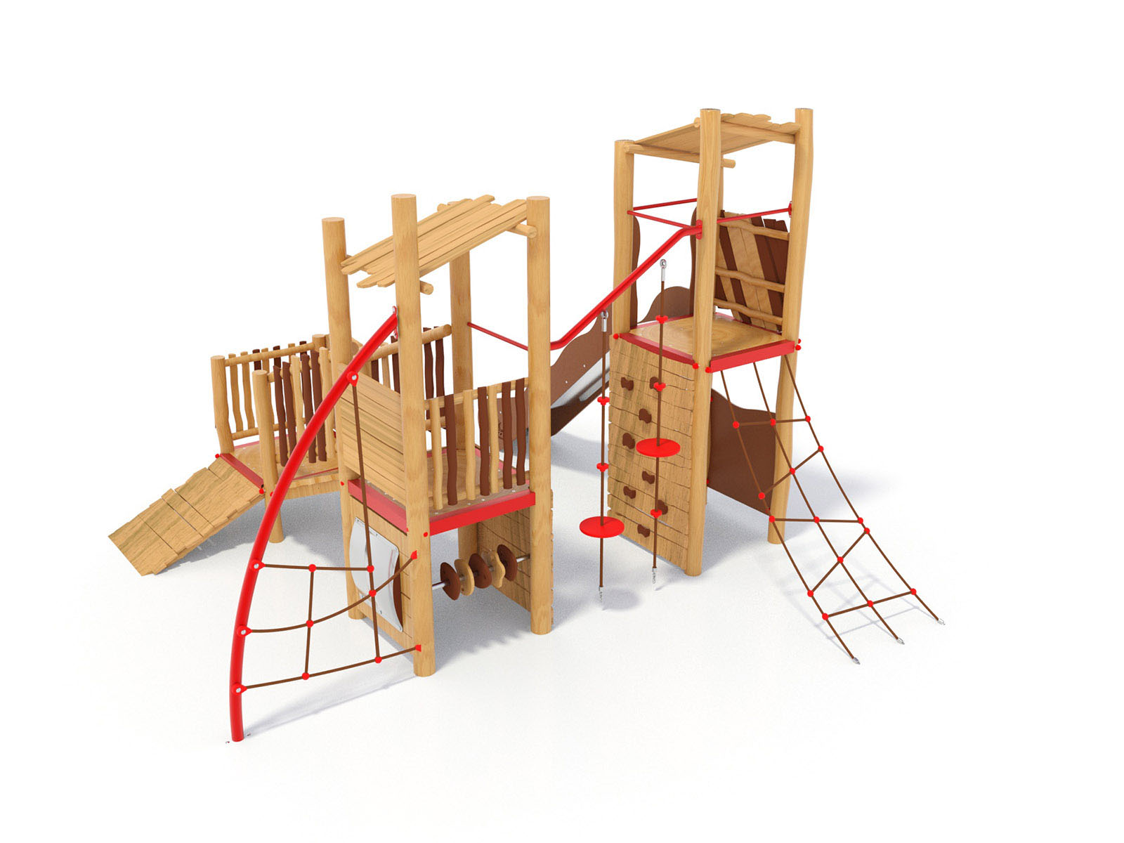 MANGO PRIMITIV EASY CON PALESTRA - multi-level structure, towers, slide and lifts with gym / AE103PPRIMITIV / Made of chestnut or black locust tree, peeled, smoothed, and with a natural and colored finish.