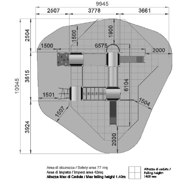 - NR 1 Kit palestra lineare - realizzata con struttura portante in legno lamellare impregnato a pressione in autoclave, rete di arrampicata in corda di acciaio rivestita e fissata alla struttura portante mediante bulloneria passante a scomparsa, spalliera verticale con pioli in acciaio inox, e fune di arrampicata con pioli