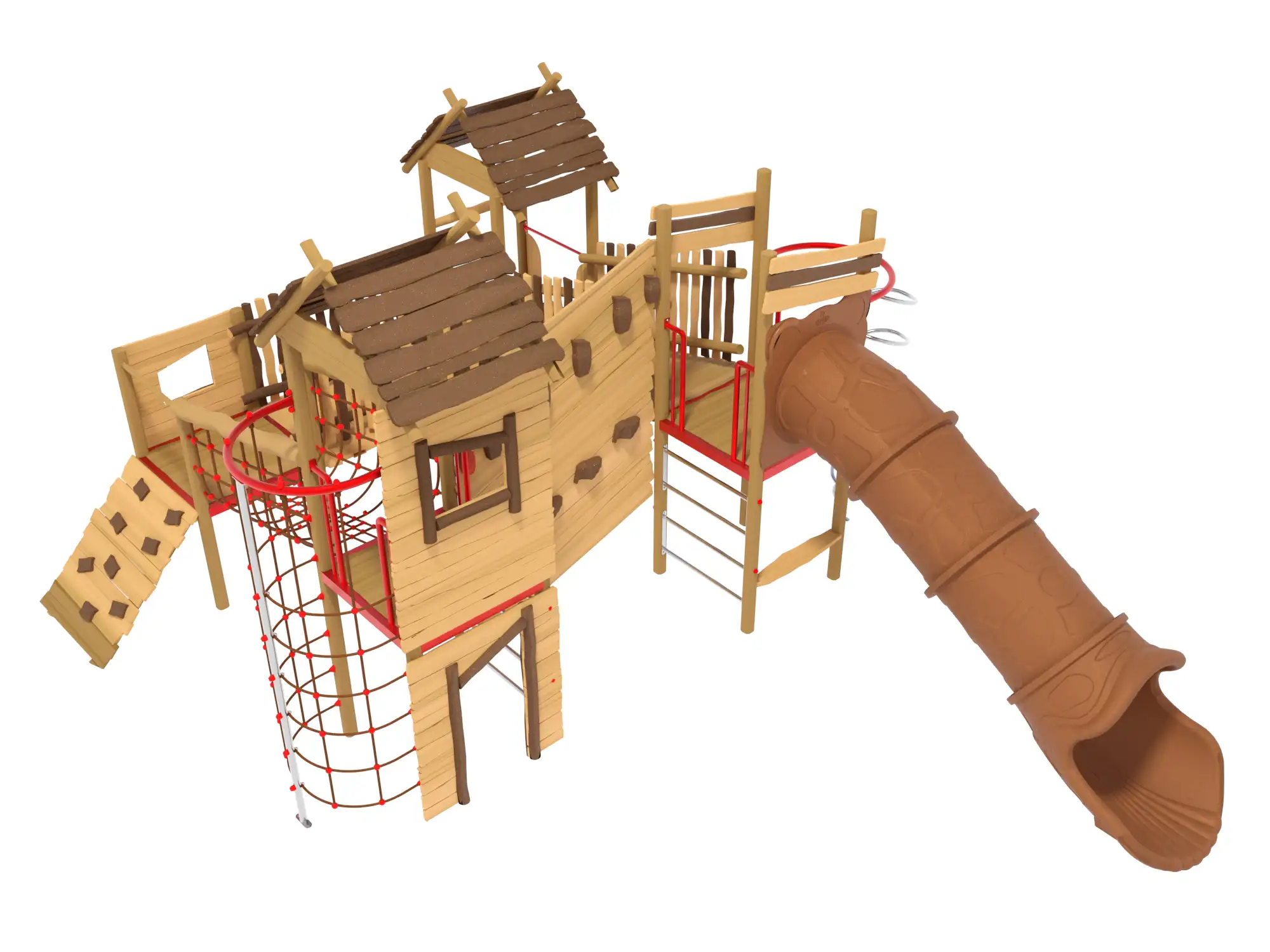 ROMA PRIMITIV CON PALESTRA SOSPESA - multi-level structure, towers, slides, lifts and gym / AF104K.PAL-05 STYLE PRIMITIV / Made of chestnut or black locust tree, peeled, smoothed, and with a natural and colored finish.