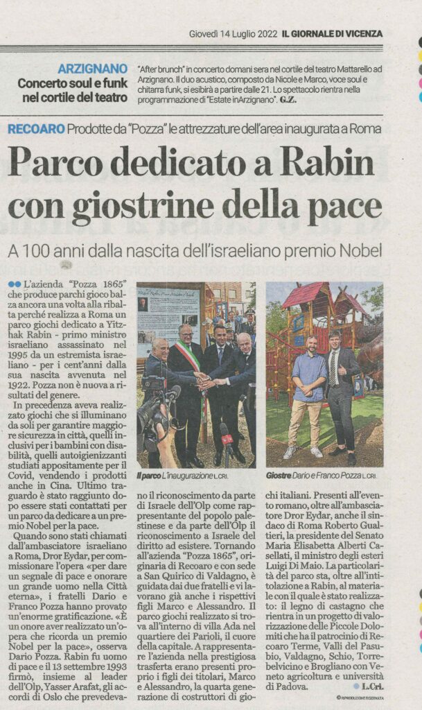 Sul Giornale di Vicenza di oggi 14 luglio 2022 ci trovate, con nostra grande soddisfazione, con l’articolo riguardo l’inaugurazione del Parco dedicato al premio Nobel Yitzhak Rabin, donato al Comune di Roma da parte dell’Ambasciata di Israele.