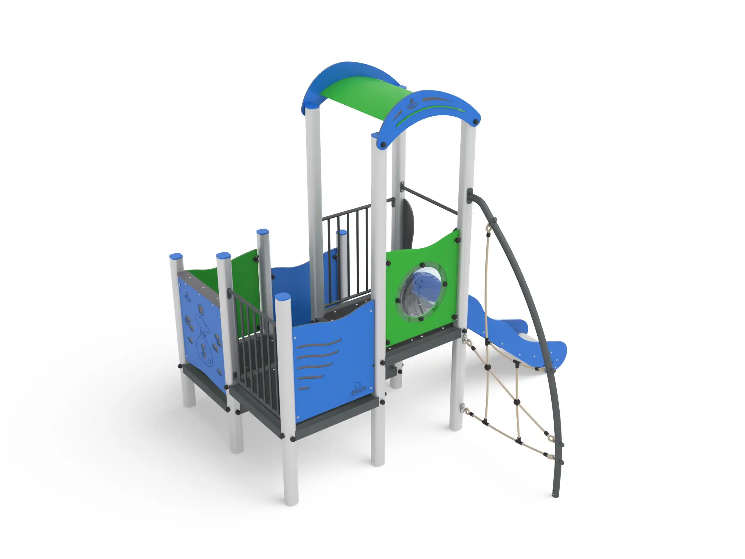 ALBICOCCA EASY BABY CON SCALA PIOLI ALLUMINIO - Struttura multitorre con scivolo e palestra / AE100B.S4-9ALU / Prodotto da azienda certificata ISO 9001, ISO 14001, PEFC e FSC. Realizzato in alluminio EN AV6060 profilo speciale mm 90x90 con spigoli arrotondati raggio mm 32 con anime interne di rinforzo. Spessore minimo mm 2,7. Tutta la bulloneria in acciaio inox.