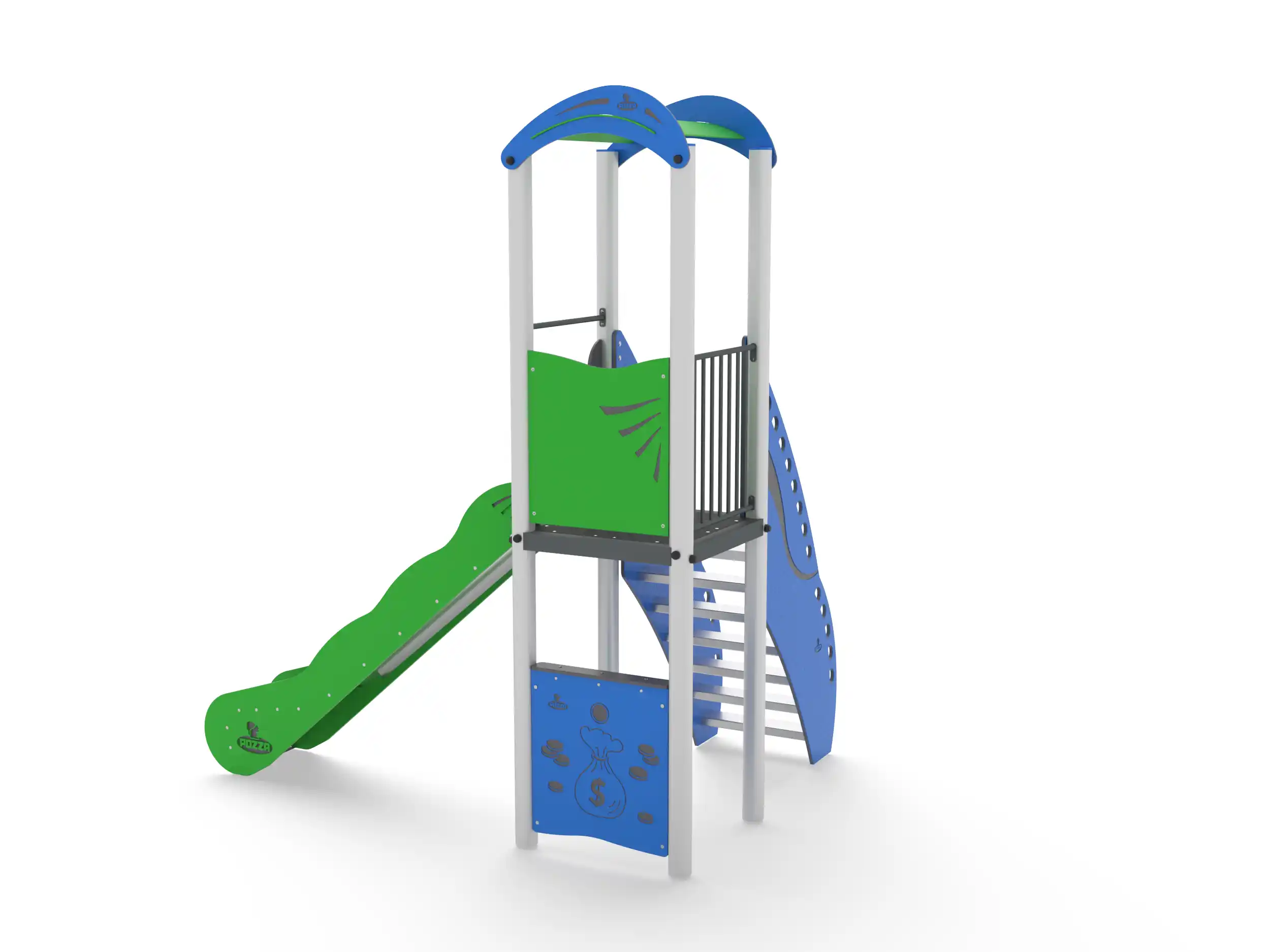 ALBICOCCA EASY CON SCALA ALLUMINIO - singola torre con scivolo e risalita / AE100.S-14ALU / Prodotto da azienda certificata ISO 9001, ISO 14001, PEFC e FSC. Realizzato in alluminio EN AV6060 profilo speciale mm 90x90 con spigoli arrotondati raggio mm 32 con anime interne di rinforzo. Spessore minimo mm 2,7. Tutta la bulloneria in acciaio inox.