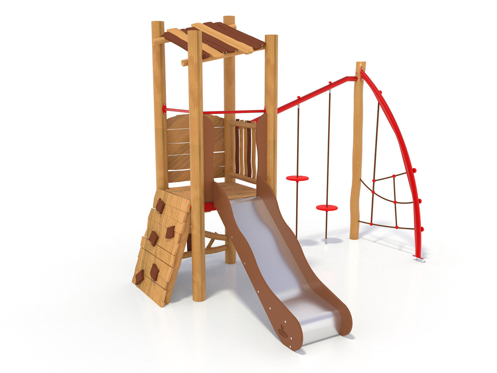ALBICOCCA PRIMITIV EASY BABY - singola torre con scivolo, risalita e palestra / AE100PbPRIMITIV / Prodotto da azienda certificata ISO 9001, ISO 14001, PEFC e FSC. Realizzato in legno di castagno naturale delle Piccole Dolomiti a chilometro 0. Tutta la bulloneria in acciaio inox.