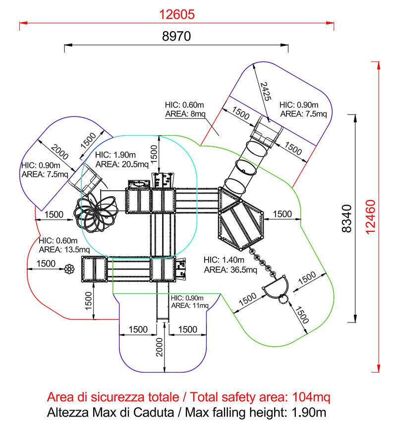 - NR 1 NG Ponte mobile dritto - Ponte fisso realizzato in con struttura portante in acciaio verniciato, con corde in acciaio rivestito in nylon come supporto per dei fiori basculanti in polietilene HDPE con pedana di sicurezza in gomma conforme ai criteri CAM
