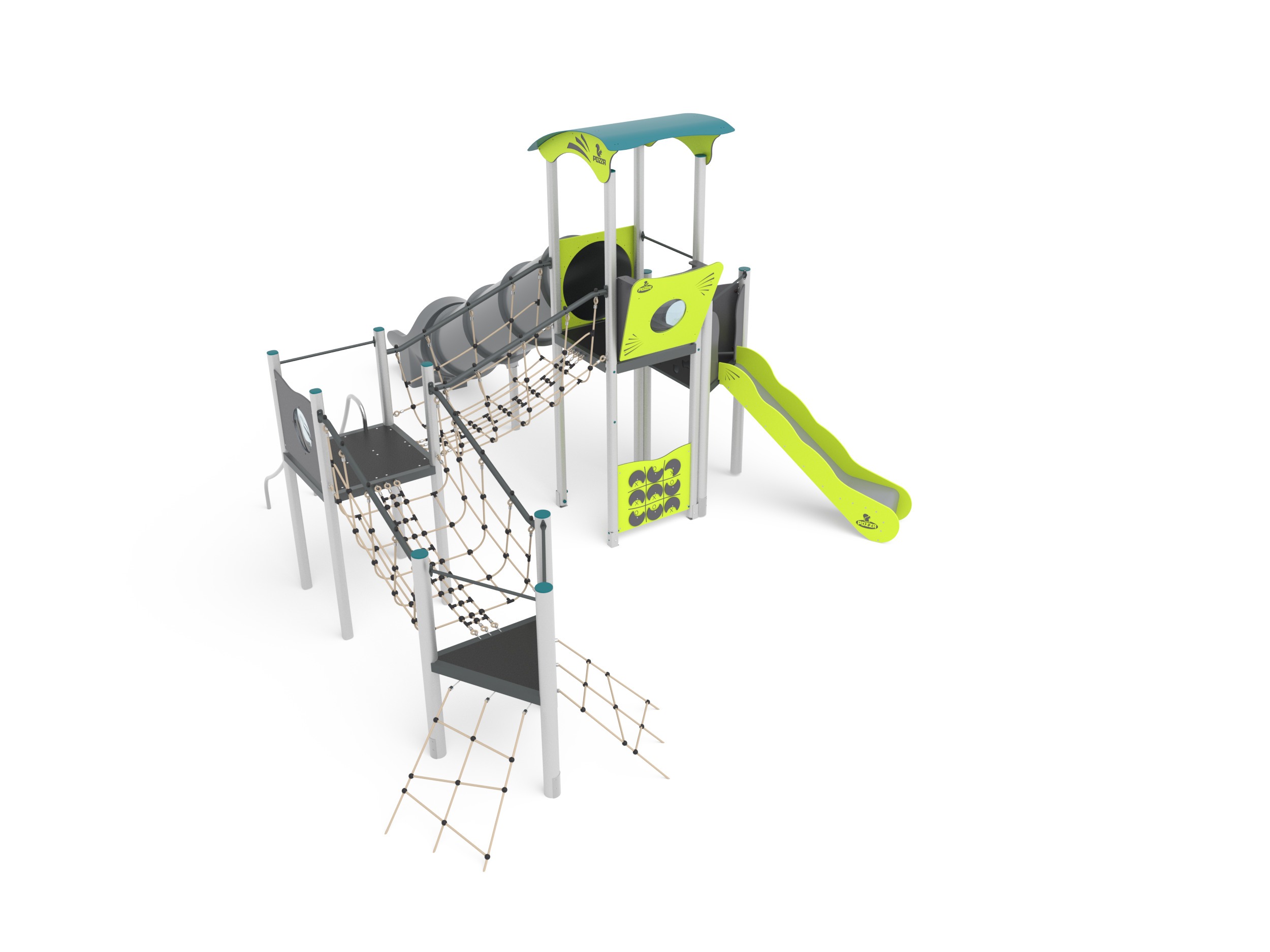 - NR 2 NG Ponte tibetano inclinato - Ponte tibetano realizzato con rete in corda di acciaio rivestita in nylon sorretta da struttura in acciaio verniciato curvo. Tutta la bulloneria e i sistemi di fissaggio in acciaio inox.