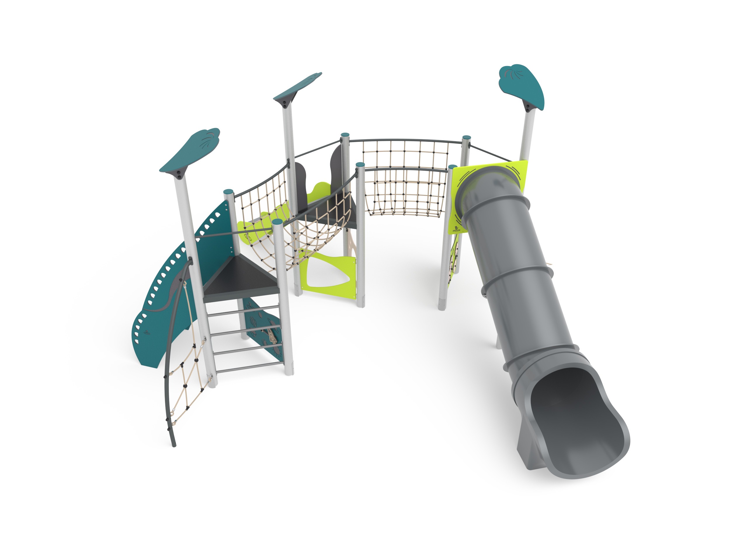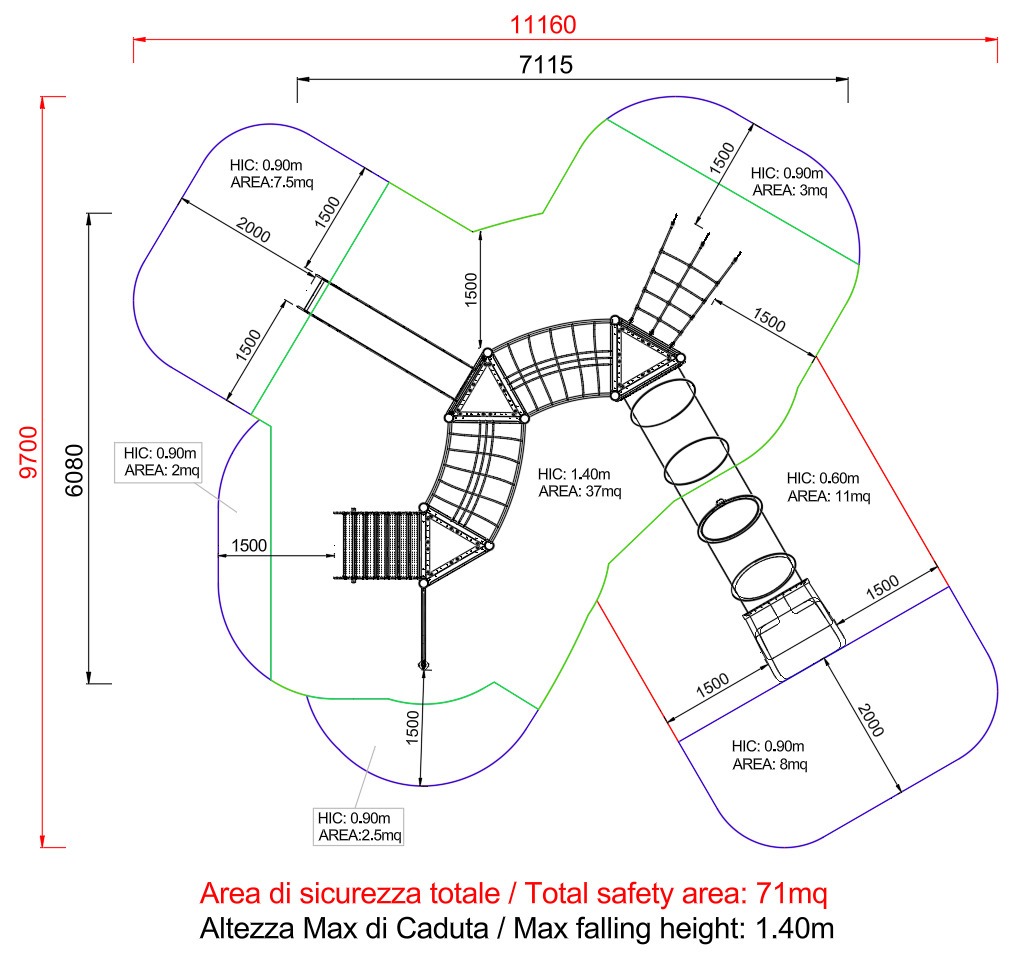 - NR 1 NG Ponte tibetano dritto curvo - Ponte tibetano curvo realizzato con rete in corda di acciaio rivestita in nylon sorretta da struttura in acciaio verniciato curvo. Tutta la bulloneria e i sistemi di fissaggio in acciaio inox.