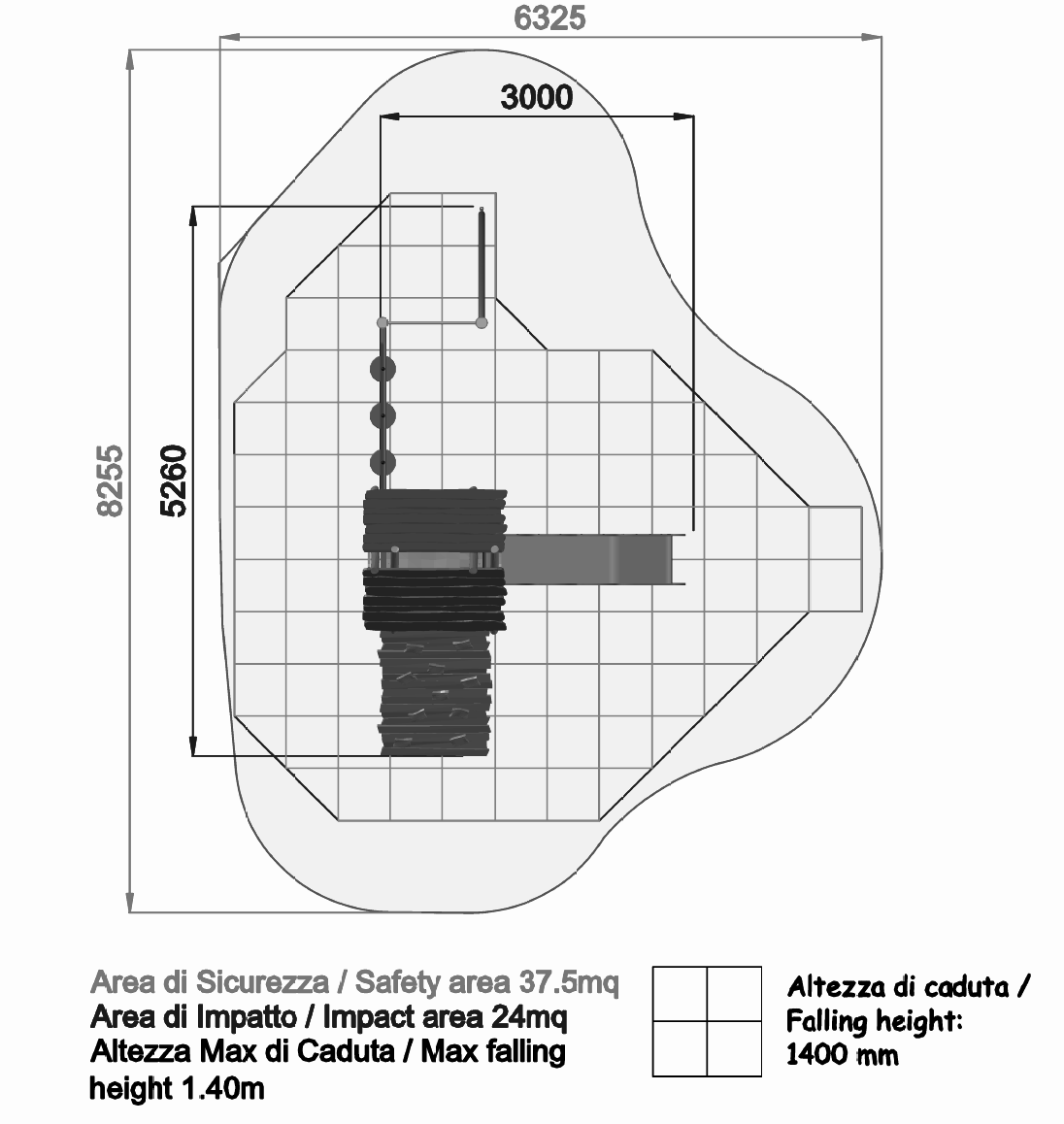- NR 1 Kit palestra ad angolo - realizzata con struttura portante in legno lamellare impregnato a pressione in autoclave secondo le normative Ral 68800, rete di arrampicata in corda di acciaio rivestita e fissata alla struttura portante mediante bulloneria passante a scomparsa, spalliera verticale con pioli in acciaio inox, e fune di arrampicata con pioli
