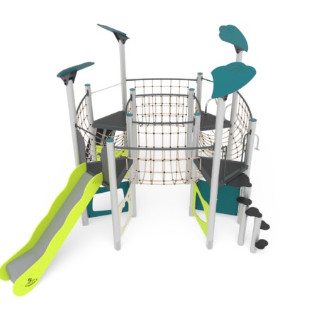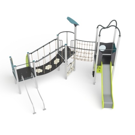 - NR 1 NG Ponte tibetano dritto curvo - Ponte tibetano curvo realizzato con rete in corda di acciaio rivestita in nylon sorretta da struttura in acciaio verniciato curvo. Tutta la bulloneria e i sistemi di fissaggio in acciaio inox.