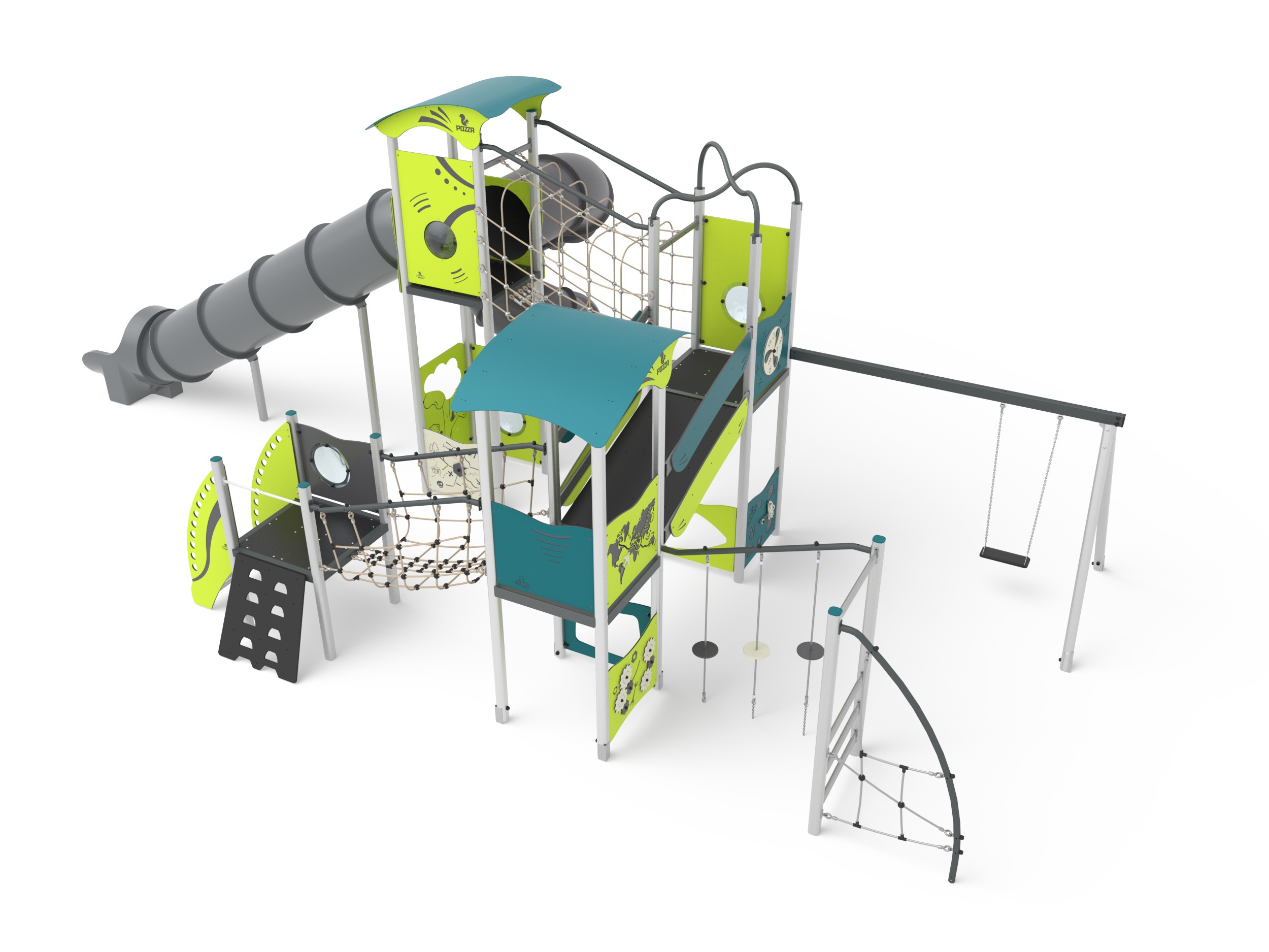 - NR 1 NG Ponte tibetano inclinato - Ponte tibetano realizzato con rete in corda di acciaio rivestita in nylon sorretta da struttura in acciaio verniciato curvo. Tutta la bulloneria e i sistemi di fissaggio in acciaio inox.