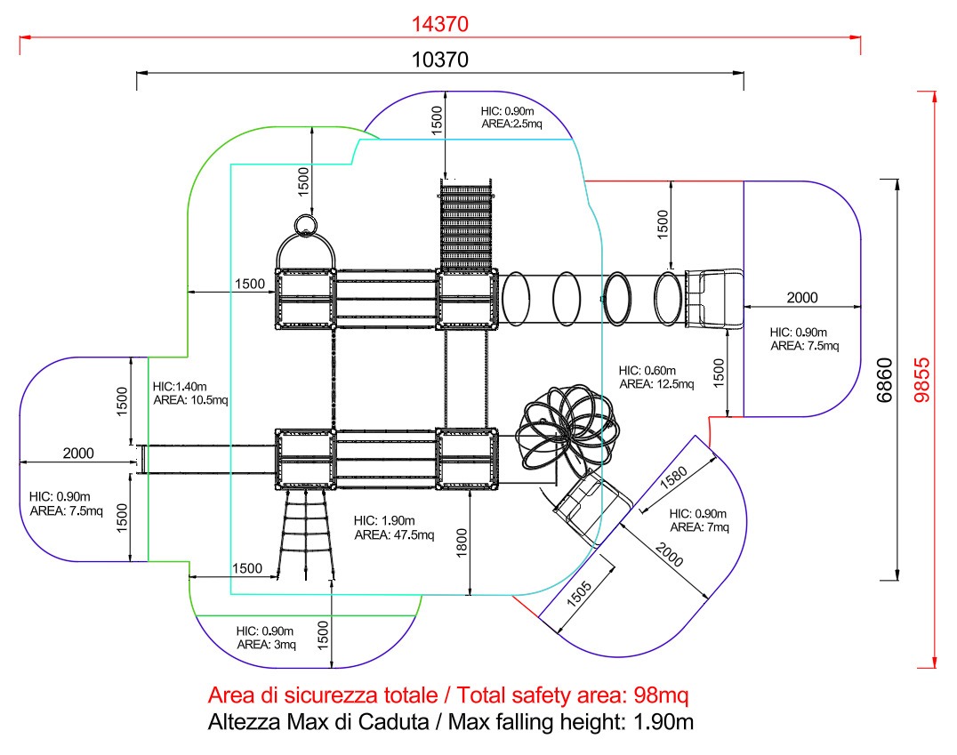 - NR 1 NG Torre h140 con tetto Fantasy - Torre altezza 140cm Realizzata con nr 4 montanti in alluminio EN EV6060 anodizzato con profilo speciale 90mm x 90mm con spigoli arrotondati raggio 32mm e anime interne di rinforzo spessore minimo 2,7 mm tutta la bulloneria e fissaggi in acciaio inox, 1 pianale dimensione 1040mm x 1040mm realizzato con profili in acciaio zincato e verniciato e pedana in plastica riciclata al 95% seconda vita spessore 25mm. Tetto realizzato con due falde in polietilene HDPE composto per il 51% di plastica riciclata spessore 20mm e un pannello curvo in polietilene