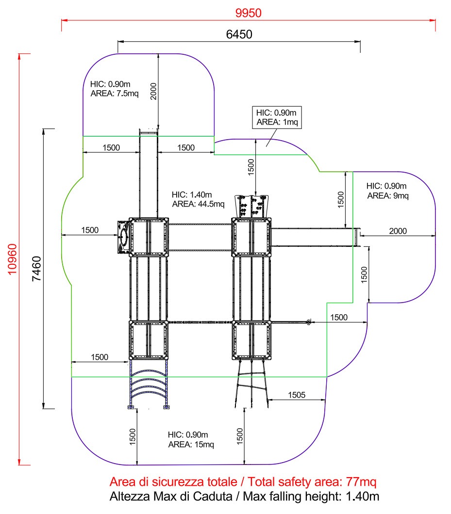 - NR 1 NG Palestra lineare - realizzata con struttura portante in legno lamellare impregnato a pressione in autoclave, rete di arrampicata in corda di acciaio rivestita e fissata alla struttura portante mediante bulloneria passante a scomparsa, spalliera verticale con pioli in acciaio inox, e fune di arrampicata con pioli