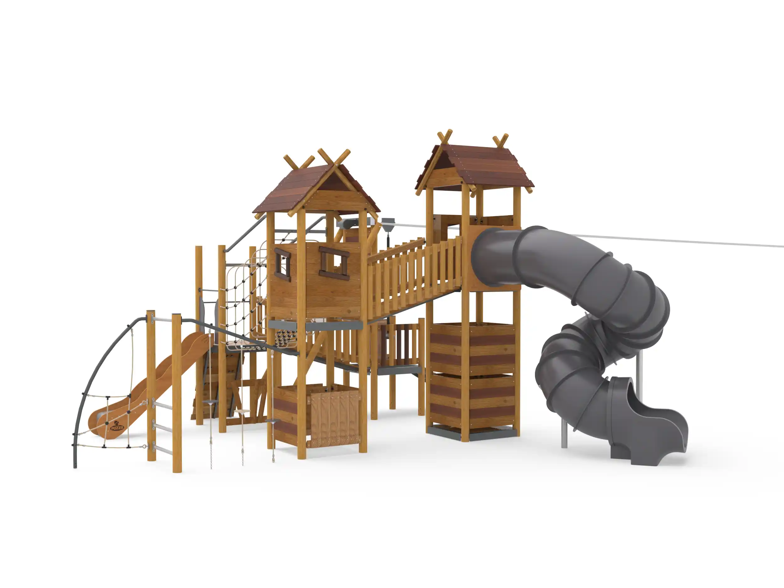 ROMA PRIMITIV CON TELEFERICA - struttura multilivello, torri, scivoli, risalite e palestra con teleferica / AF104K.KK030 style PRIMITIV / Prodotto da azienda certificata ISO 9001, ISO 14001, PEFC e FSC. Realizzato in legno di castagno naturale delle Piccole Dolomiti a chilometro 0. Tutta la bulloneria in acciaio inox.