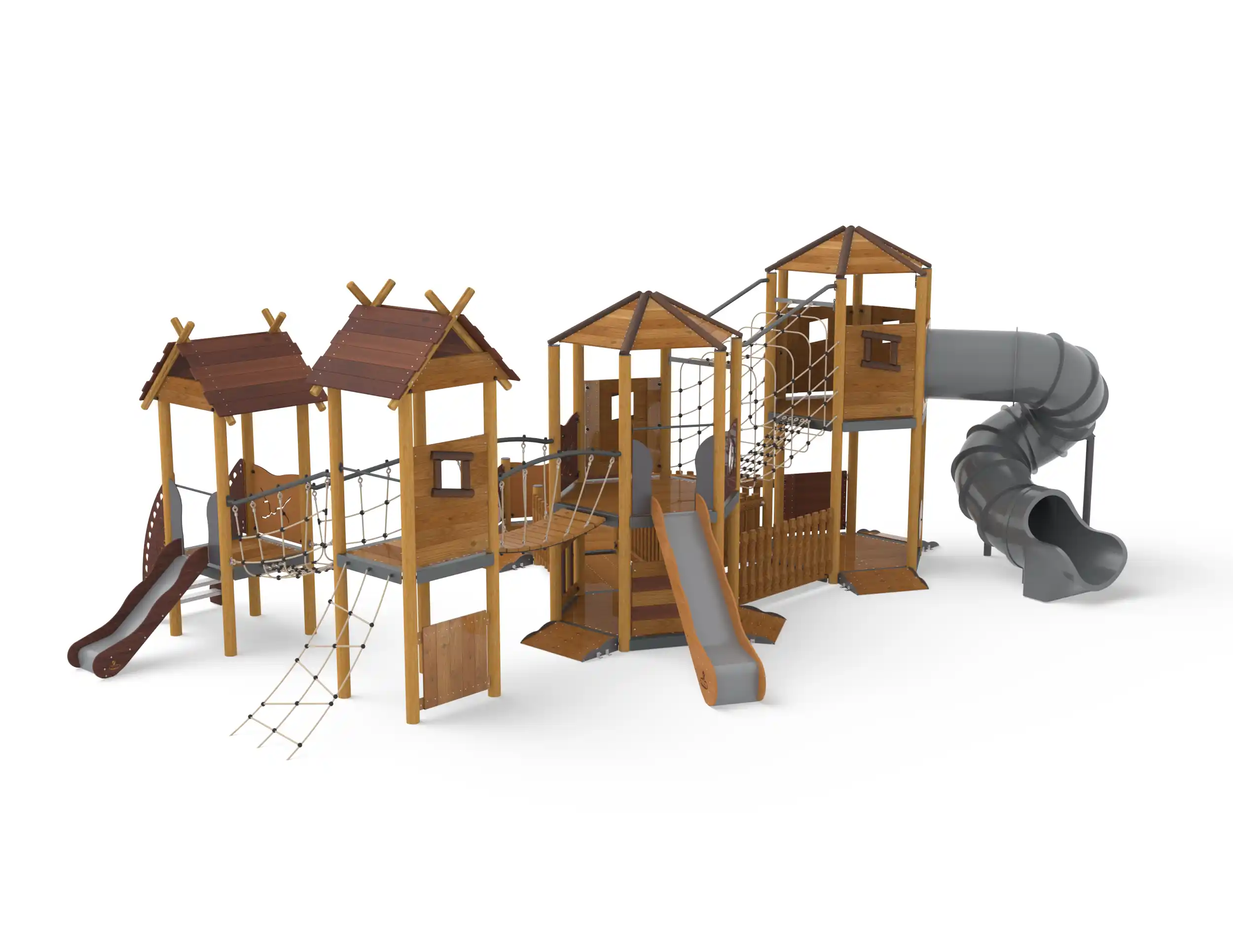 SATURNO PRIMITIV - struttura inclusiva, torri multilivello, scivoli e risalite accessibili / AF301H19 style PRIMITIV / Prodotto da azienda certificata ISO 9001, ISO 14001, PEFC e FSC. Realizzato in legno di castagno naturale delle Piccole Dolomiti a chilometro 0. Tutta la bulloneria in acciaio inox.